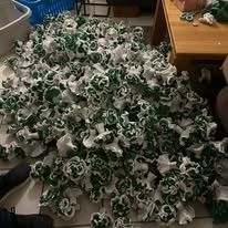 Gestern dann sorgten die Nachbarn und der Laternenklub unserer Königin Hille und von König Dominik vom @schuetzenverein_kloster für grün-weißen Rosenzauber. Sage und schreibe 1400 Röschen wurden gebunden und werden im Mai den Bogen vor Hilles Tür sowie zum Klosterschützenfest den Königsbogen zieren.