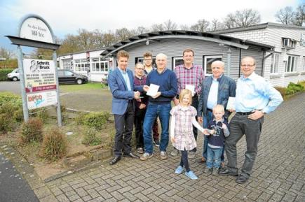 Erste Exemplare der Jubiläums-Festschrift überreichte jetzt (v. l.) Reinhard Leuderalbert (Schrift & Druck Medienagentur) zusammen mit seinen Mitarbeitern Stefan Abbing und Leon Symanski an Präsident Gerd Füchtmann und die weiteren Mitglieder des Redaktionsteams: Heinz Plietker, Franz Herking und Ludger Vortkamp, der zur Übergabe Schützen-Nachwuchs in Gestalt seiner Kinder Hanna und Thomas mitbrachte. Leuderalbert gehörte auch dem Redaktionsteam an.