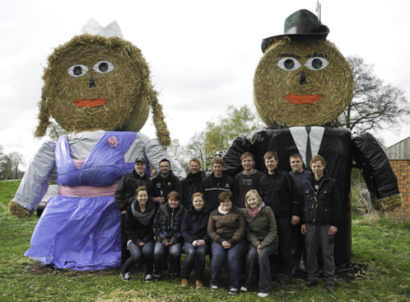 Ein Strohpuppen-Kaiserpaar grüßt seit dem Wochenende die Vorbeireisenden an der Nienborger Straße. Gebaut wurde das Traumpaar von Jugendlichen und jungen Erwachsenen der Nachbarschaft „Füchte“. Sie nahmen das Jubiläumsschützenfest der St.-Katharina-Gilde, das am übernächsten Wochenende gefeiert wird, zum Anlass, ein vergängliches „Denkmal“ zu errichten, das jetzt auf den 425. Geburtstag der Gilde aufmerksam macht.